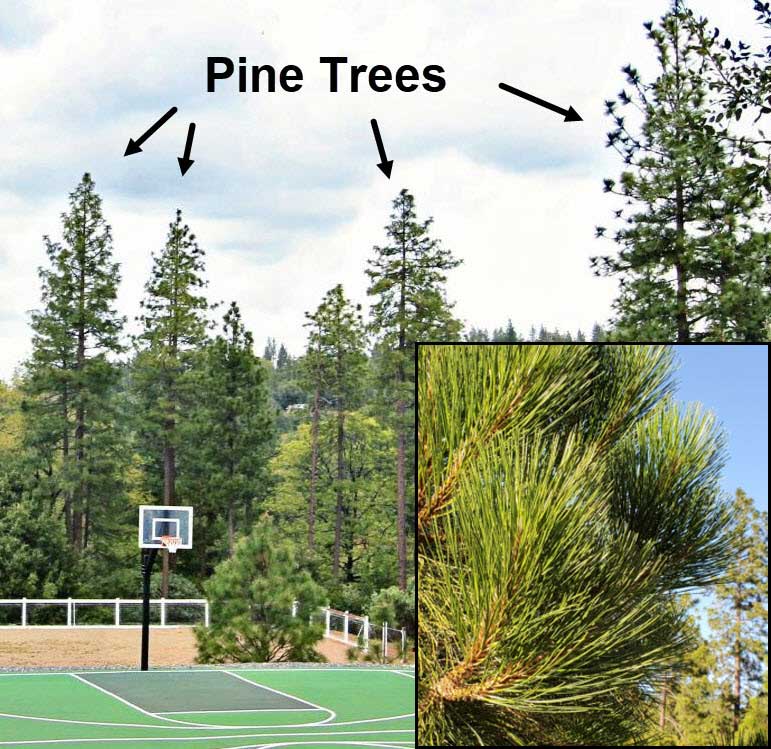 Pine trees are evergreen and are found at higher elevations so are one of the trees you’ll see in the Sierra mountains. The ranch is high enough that we have many pine trees of various sizes. Pine trees have “needles” instead of flat leaves and often have pinecones hanging on their branches too.